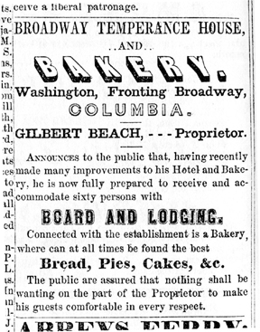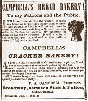 1863 Campbell's Bread Bakery. So the ad reads in Columbia newspaper. On Broadway between State & Fulton. P.A. Campbell also advertises his Cracker Bakery.