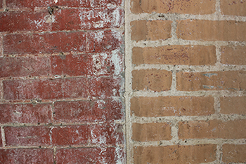 The example above shows the untreated brick (which shows the remnants of white paint) along side that which was treated