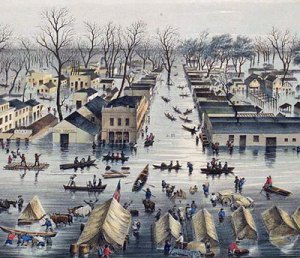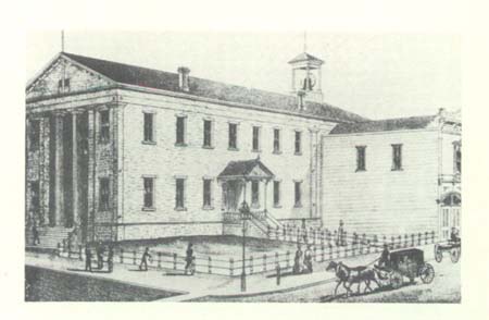 The new courthouse had been completed in 1851. It was a wooden two story building with four columns in front which supported a balcony. Sacramento was growing by leaps and bounds with more than 55 hotels alone. All forms of transportation were available at this time from buggies to steamboat service on the river. Legislators were excited to at last have a permanent capital. There were plenty of facilities to house all the people who helped to run the government for California. It was unfortunate that just after the end of this session, on 13 July 1854, a fire destroyed the courthouse and much of the city itself. On 27 September 1854, a new foundation was laid. This site for the first two buildings is now the site of the Sacramento County Jail. Designated as State Historic Landmark No. 869.