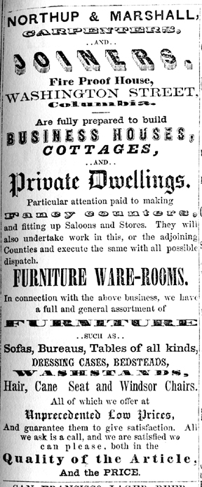 1856 Northup & Marshall run an ad in the Miners & Business Men's Directory Located on Washington Street in a fire proof house.