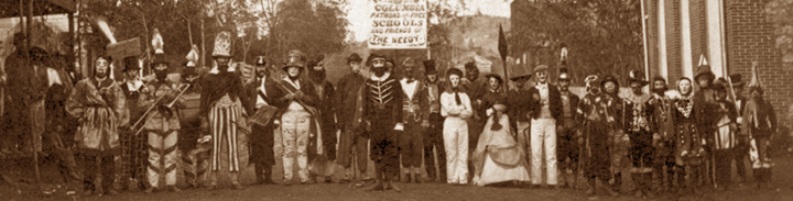 The day was ushered in with a national salute from a brass field-piece, which by some means, has found its way into the mountains. According to previous arrangements, at precisely ten o'clock, the procession was formed at the chapel and proceeded through the principal streets to the large amphitheater. This was the first thing of the kind ever attempted in this county, and reflects great credit upon the citizens of Columbia. In the first place; was the Hook and Ladder Company proceeded by a fine band of music; they were followed by a school from Sonora, and another from Shaws Flat, each with a banner, an interesting sight for the mines. Next came the ladies, some forty strong, God bless them. The Masonic fraternity in their splendid regalia and with several banners made an imposing appearance, they numbered near one hundred; they were followed by the miners, one of them wheeling a barrow in which was the miners 'kit' and cooking utensils, others had a 'long-tom' mounted upon wheels which they dragged triumphantly along, which one of their number mounted upon the top, was busily engaged in with his shovel. The cavalcade from Jamestown and Camp Seco, made a fine appearance; they were preceded by a band and flags.