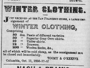 1855 The store is Toomey and O'Keefe's San Francisco Store--Family Grocery, etc. The sign that was painted at the top of the building can still be faintly read (2006).